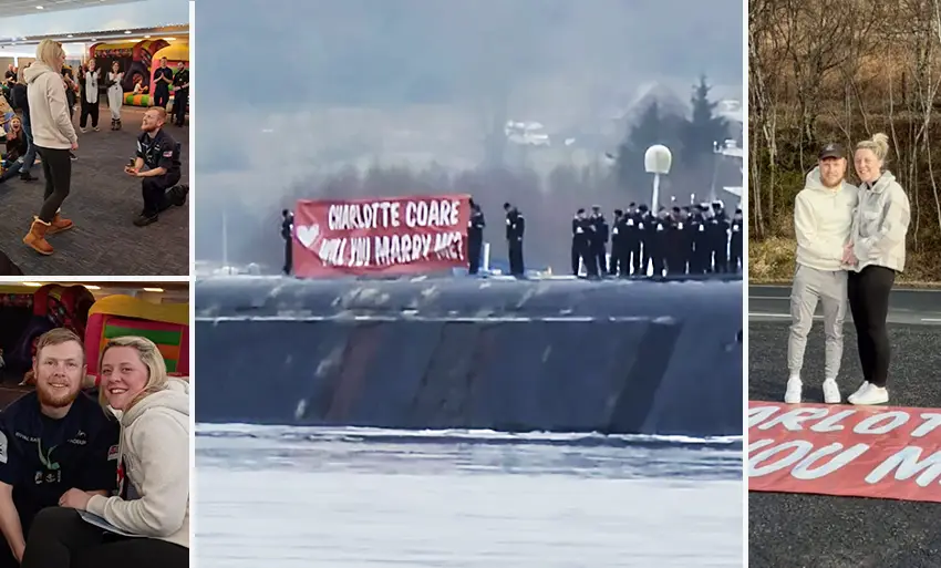 As the submarine returned to Rhu in Scotland, an eye-catching red banner reading ‘Will you marry me?’ was clearly visible on top of the submarine, held by two of the crew as they approached the large crowds of loved ones who had come to celebrate their return home. His girlfriend Charlotte was overjoyed at seeing the banner resulting in a positive acceptance to Lucas’ proposal and a wonderful welcome home.